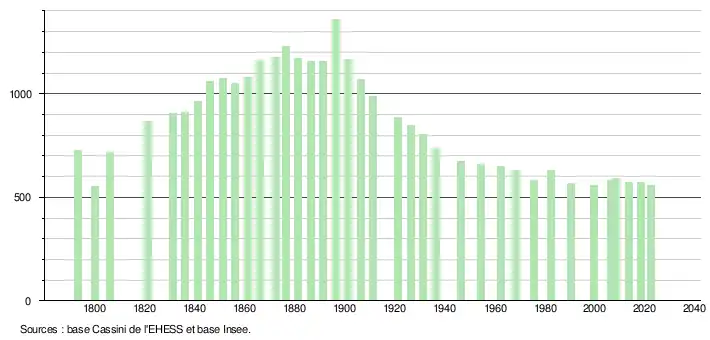 En 2022, la commune comptait 558 habitants[Note 3], en évolution de −2,45 % par rapport à 2016 (Saône-et-Loire : −1,06 %, France hors Mayotte : +2,11 %).