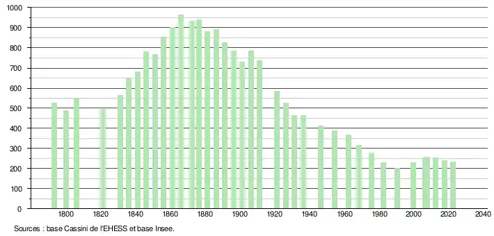 L'évolution du nombre d'habitants est connue à travers les recensements de la population effectués dans la commune depuis 1793. Pour les communes de moins de 10 000 habitants, une enquête de recensement portant sur toute la population est réalisée tous les cinq ans, les populations de référence des années intermédiaires étant quant à elles estimées par interpolation ou extrapolation[20]. Pour la commune, le premier recensement exhaustif entrant dans le cadre du nouveau dispositif a été réalisé en 2007[21].