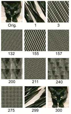 Si l'on applique cette transformation plusieurs fois de suite, on constate un comportement radicalement différent et surprenant. En effet, on retrouve au bout d'un nombre fini d'itérations l'image de départ (image ci-contre).