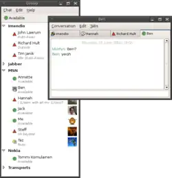 Dans ce programme de discussion en ligne typique, la fenêtre de gauche affiche une liste de contacts et la fenêtre de droite, une conversation entre l'utilisateur et l'un de ces contacts.