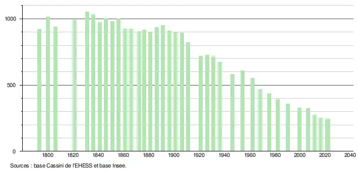L'évolution du nombre d'habitants est connue à travers les recensements de la population effectués dans la commune depuis 1793. Pour les communes de moins de 10 000 habitants, une enquête de recensement portant sur toute la population est réalisée tous les cinq ans, les populations de référence des années intermédiaires étant quant à elles estimées par interpolation ou extrapolation[25]. Pour la commune, le premier recensement exhaustif entrant dans le cadre du nouveau dispositif a été réalisé en 2006[26].