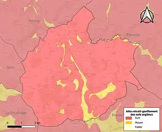 Les mouvements de terrains susceptibles de se produire sur la commune sont des affaissements et effondrements liés aux cavités souterraines (hors mines) et des tassements différentiels[16]. Afin de mieux appréhender le risque d’affaissement de terrain, un inventaire national permet de localiser les éventuelles cavités souterraines sur la commune[17]. Le retrait-gonflement des sols argileux est susceptible d'engendrer des dommages importants aux bâtiments en cas d’alternance de périodes de sécheresse et de pluie[18]. La totalité de la commune est en aléa moyen ou fort (79,5 % au niveau départemental et 48,5 % au niveau national)[Carte 2]. Depuis le , en application de la loi ÉLAN, différentes contraintes s'imposent aux vendeurs, maîtres d'ouvrages ou constructeurs de biens situés dans une zone classée en aléa moyen ou fort[Note 1],[19].