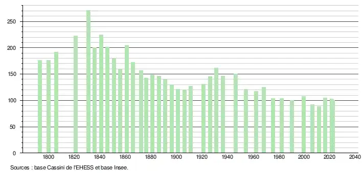 L'évolution du nombre d'habitants est connue à travers les recensements de la population effectués dans la commune depuis 1793. Pour les communes de moins de 10 000 habitants, une enquête de recensement portant sur toute la population est réalisée tous les cinq ans, les populations de référence des années intermédiaires étant quant à elles estimées par interpolation ou extrapolation[13]. Pour la commune, le premier recensement exhaustif entrant dans le cadre du nouveau dispositif a été réalisé en 2006[14].