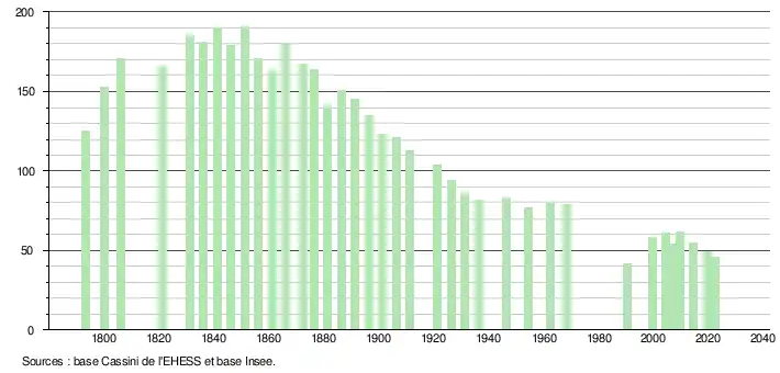 L'évolution du nombre d'habitants est connue à travers les recensements de la population effectués dans la commune depuis 1793. Pour les communes de moins de 10 000 habitants, une enquête de recensement portant sur toute la population est réalisée tous les cinq ans, les populations de référence des années intermédiaires étant quant à elles estimées par interpolation ou extrapolation[14]. Pour la commune, le premier recensement exhaustif entrant dans le cadre du nouveau dispositif a été réalisé en 2004[15].
