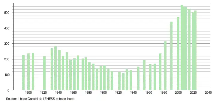L'évolution du nombre d'habitants est connue à travers les recensements de la population effectués dans la commune depuis 1793. Pour les communes de moins de 10 000 habitants, une enquête de recensement portant sur toute la population est réalisée tous les cinq ans, les populations de référence des années intermédiaires étant quant à elles estimées par interpolation ou extrapolation[18]. Pour la commune, le premier recensement exhaustif entrant dans le cadre du nouveau dispositif a été réalisé en 2004[19].