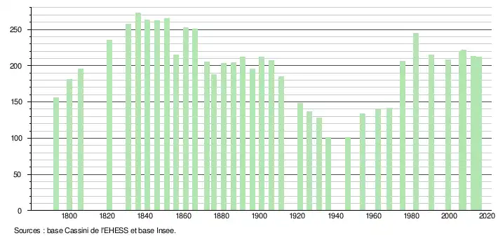 L'évolution du nombre d'habitants est connue à travers les recensements de la population effectués dans la commune depuis 1793. Pour les communes de moins de 10 000 habitants, une enquête de recensement portant sur toute la population est réalisée tous les cinq ans, les populations de référence des années intermédiaires étant quant à elles estimées par interpolation ou extrapolation[4]. Pour la commune, le premier recensement exhaustif entrant dans le cadre du nouveau dispositif a été réalisé en 2007[5].