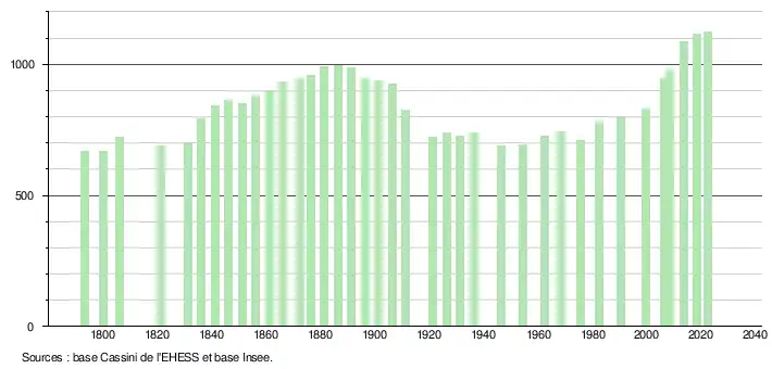 L'évolution du nombre d'habitants est connue à travers les recensements de la population effectués dans la commune depuis 1793. Pour les communes de moins de 10 000 habitants, une enquête de recensement portant sur toute la population est réalisée tous les cinq ans, les populations de référence des années intermédiaires étant quant à elles estimées par interpolation ou extrapolation[15]. Pour la commune, le premier recensement exhaustif entrant dans le cadre du nouveau dispositif a été réalisé en 2008[16].