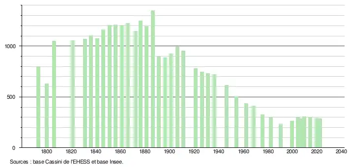 L'évolution du nombre d'habitants est connue à travers les recensements de la population effectués dans la commune depuis 1793. Pour les communes de moins de 10 000 habitants, une enquête de recensement portant sur toute la population est réalisée tous les cinq ans, les populations de référence des années intermédiaires étant quant à elles estimées par interpolation ou extrapolation[30]. Pour la commune, le premier recensement exhaustif entrant dans le cadre du nouveau dispositif a été réalisé en 2004[31].