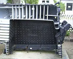 Coupe de la chaudière d'une locomotive. Notez les espaces d'eau étroits autour de la chambre de combustion et le "trou de boue" pour l'accès à la feuille de couronne : ces zones nécessitent une attention particulière pendant le lavage[10]. Les locomotives préservées d'aujourd'hui ne sont généralement pas maintenues en continu dans la vapeur et l'intervalle de lavage recommandé est maintenant de quinze à trente jours, mais il est possible d'aller jusqu'à 180 jours[11].