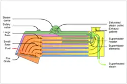Dans la chaudière de la locomotive, la vapeur saturée passe très souvent dans un surchauffeur, en revenant par les grands conduits de fumée au sommet de la chaudière, pour sécher la vapeur et la chauffer en vapeur surchauffée. La vapeur surchauffée est dirigée vers les cylindres de la machine à vapeur ou, très rarement, vers une turbine pour produire un travail mécanique. Les gaz d'échappement sont évacués par une cheminée et peuvent être utilisés pour préchauffer l'eau d'alimentation afin d'augmenter le rendement de la chaudière.