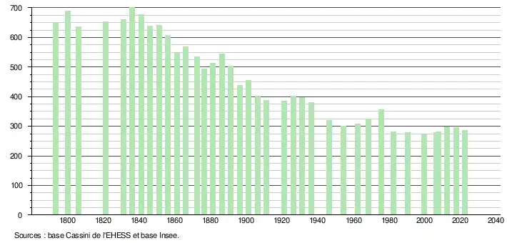 L'évolution du nombre d'habitants est connue à travers les recensements de la population effectués dans la commune depuis 1793. Pour les communes de moins de 10 000 habitants, une enquête de recensement portant sur toute la population est réalisée tous les cinq ans, les populations de référence des années intermédiaires étant quant à elles estimées par interpolation ou extrapolation[36]. Pour la commune, le premier recensement exhaustif entrant dans le cadre du nouveau dispositif a été réalisé en 2007[37].