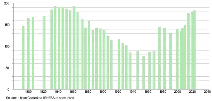 L'évolution du nombre d'habitants est connue à travers les recensements de la population effectués dans la commune depuis 1793. Pour les communes de moins de 10 000 habitants, une enquête de recensement portant sur toute la population est réalisée tous les cinq ans, les populations de référence des années intermédiaires étant quant à elles estimées par interpolation ou extrapolation[13]. Pour la commune, le premier recensement exhaustif entrant dans le cadre du nouveau dispositif a été réalisé en 2004[14].