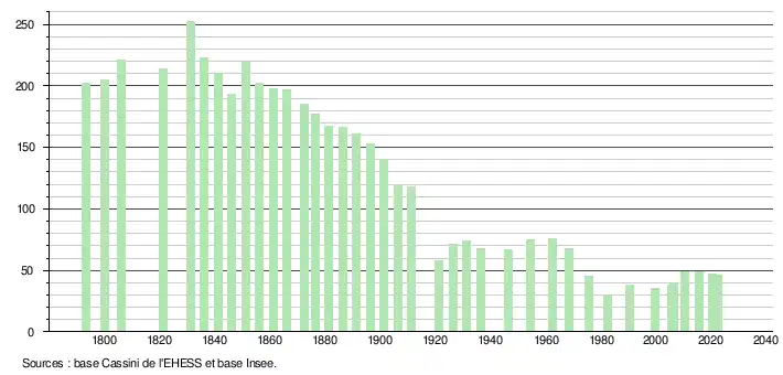 L'évolution du nombre d'habitants est connue à travers les recensements de la population effectués dans la commune depuis 1793. Pour les communes de moins de 10 000 habitants, une enquête de recensement portant sur toute la population est réalisée tous les cinq ans, les populations de référence des années intermédiaires étant quant à elles estimées par interpolation ou extrapolation[19]. Pour la commune, le premier recensement exhaustif entrant dans le cadre du nouveau dispositif a été réalisé en 2005[20].