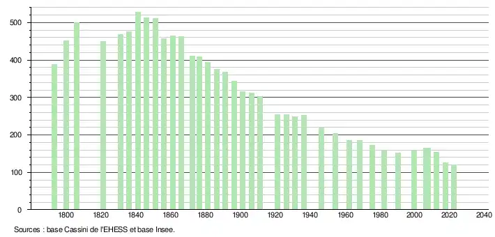 L'évolution du nombre d'habitants est connue à travers les recensements de la population effectués dans la commune depuis 1793. Pour les communes de moins de 10 000 habitants, une enquête de recensement portant sur toute la population est réalisée tous les cinq ans, les populations de référence des années intermédiaires étant quant à elles estimées par interpolation ou extrapolation[20]. Pour la commune, le premier recensement exhaustif entrant dans le cadre du nouveau dispositif a été réalisé en 2007[21].