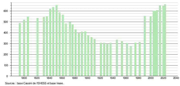 L'évolution du nombre d'habitants est connue à travers les recensements de la population effectués dans la commune depuis 1793. Pour les communes de moins de 10 000 habitants, une enquête de recensement portant sur toute la population est réalisée tous les cinq ans, les populations de référence des années intermédiaires étant quant à elles estimées par interpolation ou extrapolation[20]. Pour la commune, le premier recensement exhaustif entrant dans le cadre du nouveau dispositif a été réalisé en 2004[21].