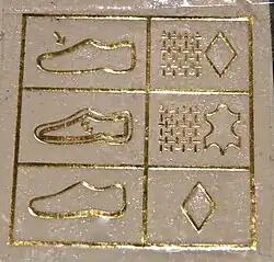 Il indique de manière simple avec des pictogrammes la composition de la Tige (extérieur), la doublure et la semelle intérieure ainsi que la semelle extérieure. Il existe quatre pictogrammes, le cuir (une peau), le cuir enduit (une peau et un petit losange), le textile (un bout de tissu carré) et les autres produits (un grand losange).