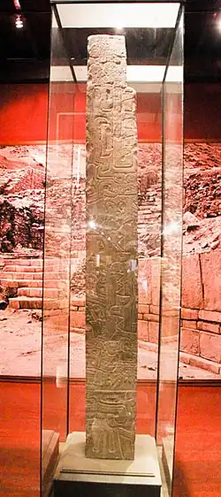 Les obélisques sont des sculptures en forme de prisme. Le plus représentatif d'entre eux est l'obélisque de Tello. Il fut découvert par Tello par hasard, alors qu'il mangeait chez un habitant local[12]. L'obélisque de Tello mesure 2,52 m de haut et 0,32 m de large à la base. Il est sculpté en hauts, bas et plans reliefs, représentant deux divinités mythiques, ou en tout cas, un double dieu hermaphrodite (masculin et féminin). Il y a aussi des divinités secondaires et divers aliments (yucca, citrouille, canne à sucre) habilement représentés.