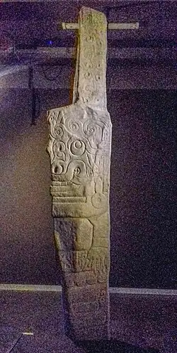 La stèle Raimondi, du nom du savant italien qui l'a découverte en 1872, laisse découvrir un motif religieux ainsi qu'une alternance de naturalisme et de stylisation. Elle est composée de granite poli incisé et mesure 1,95 m de long, 0,74 m de large et 0,17 m d'épaisseur. La stèle représente un dieu appelé « Dieu aux bâtons » ou encore « Dieu aux sceptres », associé à la fertilité et à la terre. Le monolithe se distingue par son dessin compliqué et sa fine sculpture, représentant un dieu anthropomorphe, aux traits félins, avec griffes et crocs, qui tient dans ses mains deux bâtons ou sceptres. Elle incarne la dualité en une seule figure : les deux faces présentent en effet la même image, mais inversée.