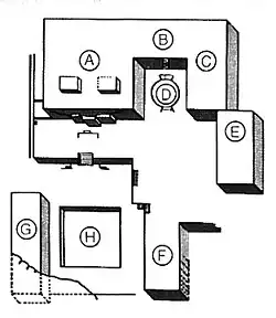 - Devant le Nouveau Temple, deux annexes ou ailes, appelées la plate-forme nord (F) et la plate-forme sud (G), flanquent une cour carrée.