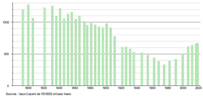 L'évolution du nombre d'habitants est connue à travers les recensements de la population effectués dans la commune depuis 1793. Pour les communes de moins de 10 000 habitants, une enquête de recensement portant sur toute la population est réalisée tous les cinq ans, les populations de référence des années intermédiaires étant quant à elles estimées par interpolation ou extrapolation[5]. Pour la commune, le premier recensement exhaustif entrant dans le cadre du nouveau dispositif a été réalisé en 2006[6].