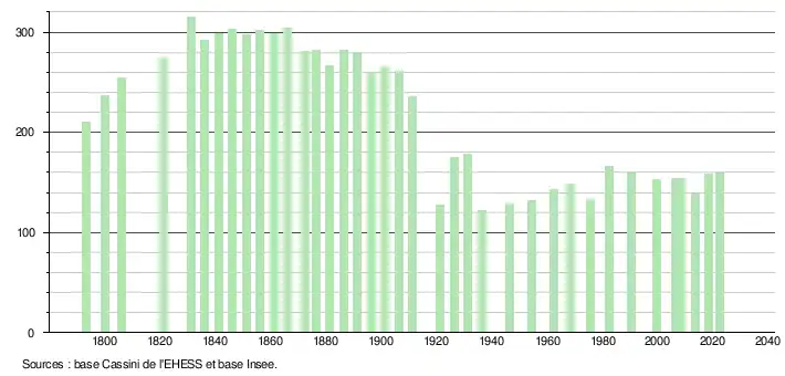 L'évolution du nombre d'habitants est connue à travers les recensements de la population effectués dans la commune depuis 1793. Pour les communes de moins de 10 000 habitants, une enquête de recensement portant sur toute la population est réalisée tous les cinq ans, les populations de référence des années intermédiaires étant quant à elles estimées par interpolation ou extrapolation[22]. Pour la commune, le premier recensement exhaustif entrant dans le cadre du nouveau dispositif a été réalisé en 2008[23].
