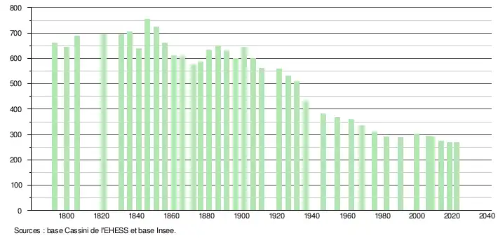 L'évolution du nombre d'habitants est connue à travers les recensements de la population effectués dans la commune depuis 1793. Pour les communes de moins de 10 000 habitants, une enquête de recensement portant sur toute la population est réalisée tous les cinq ans, les populations de référence des années intermédiaires étant quant à elles estimées par interpolation ou extrapolation[30]. Pour la commune, le premier recensement exhaustif entrant dans le cadre du nouveau dispositif a été réalisé en 2008[31].