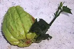 Le fruit est une grosse baie d'une dizaine de centimètres de longueur, en forme de poire biscornue, à côtes irrégulières pouvant peser de 500 grammes à 2 kg. Il est jaune crème ou vert pâle, et peut être épineux. Il n'a, contrairement aux autres cucurbitacées, qu'une seule graine. Cette graine est très grosse, à tégument mince, difficile à extraire du fruit.