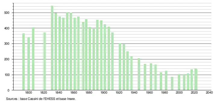 L'évolution du nombre d'habitants est connue à travers les recensements de la population effectués dans la commune depuis 1793. Pour les communes de moins de 10 000 habitants, une enquête de recensement portant sur toute la population est réalisée tous les cinq ans, les populations de référence des années intermédiaires étant quant à elles estimées par interpolation ou extrapolation[16]. Pour la commune, le premier recensement exhaustif entrant dans le cadre du nouveau dispositif a été réalisé en 2006[17].