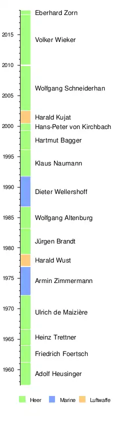 | 2010–2018 | Général Volker Wieker (*1954) | Armée de terre (Heer) | Karl-Theodor zu Guttenberg Thomas de Maizière Ursula von der Leyen | ![]() |