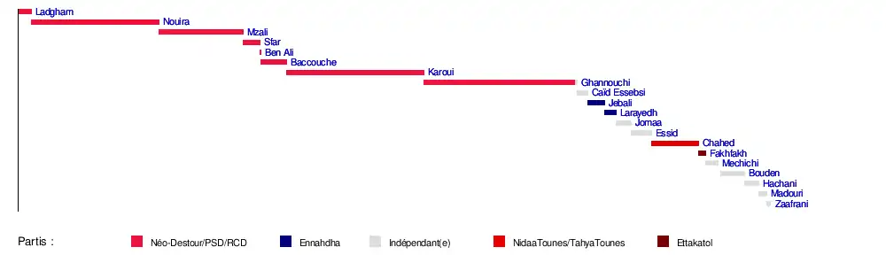 À la suite de la révolution de 2011, le Premier ministre devient chef du gouvernement et se voit attribuer l'essentiel du pouvoir exécutif. En vertu de la loi constituante de 2011 puis de la Constitution de 2014, le président de la République charge le candidat du parti politique ayant obtenu le plus grand nombre de sièges à l'assemblée de former le gouvernement.