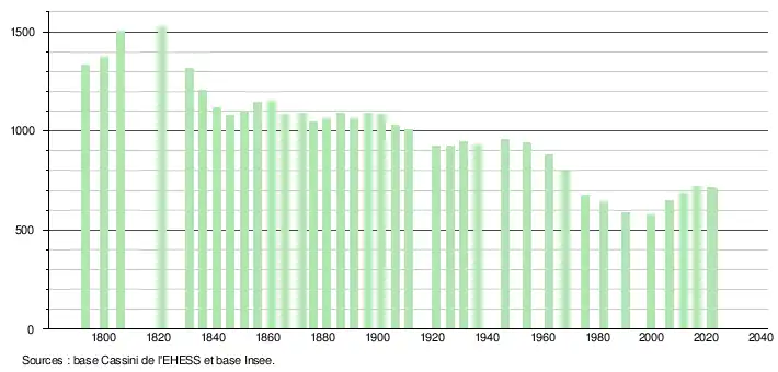 L'évolution du nombre d'habitants est connue à travers les recensements de la population effectués dans la commune depuis 1793. Pour les communes de moins de 10 000 habitants, une enquête de recensement portant sur toute la population est réalisée tous les cinq ans, les populations de référence des années intermédiaires étant quant à elles estimées par interpolation ou extrapolation[30]. Pour la commune, le premier recensement exhaustif entrant dans le cadre du nouveau dispositif a été réalisé en 2006[31].