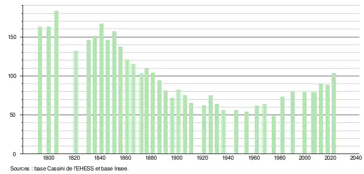 L'évolution du nombre d'habitants est connue à travers les recensements de la population effectués dans la commune depuis 1793. Pour les communes de moins de 10 000 habitants, une enquête de recensement portant sur toute la population est réalisée tous les cinq ans, les populations de référence des années intermédiaires étant quant à elles estimées par interpolation ou extrapolation[19]. Pour la commune, le premier recensement exhaustif entrant dans le cadre du nouveau dispositif a été réalisé en 2007[20].