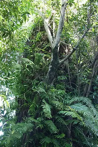 Vue de la cheminée de La Trinité perdue sous la végétation qui pousse sur elle.