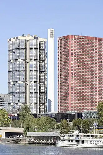 Vue d'ensemble du Front de Seine, centrée sur la cheminée, depuis l'île aux Cygnes.