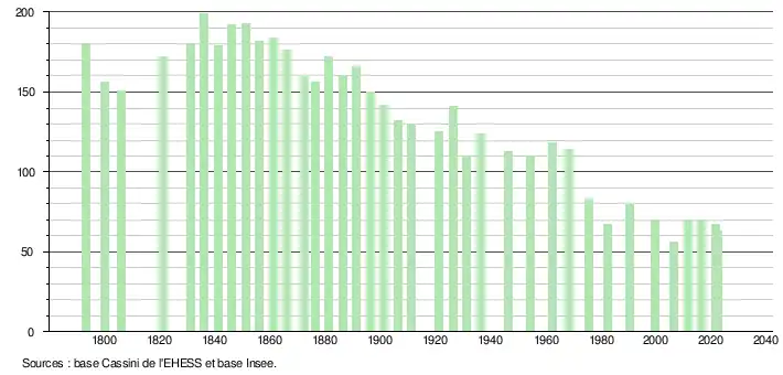 L'évolution du nombre d'habitants est connue à travers les recensements de la population effectués dans la commune depuis 1793. Pour les communes de moins de 10 000 habitants, une enquête de recensement portant sur toute la population est réalisée tous les cinq ans, les populations de référence des années intermédiaires étant quant à elles estimées par interpolation ou extrapolation[13]. Pour la commune, le premier recensement exhaustif entrant dans le cadre du nouveau dispositif a été réalisé en 2006[14].