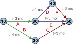 C'est le cas dans l'exemple donné ci-contre, avec les deux chemins A→D→F (3+1+3 = 7 mois) et B→C, 7 mois également.