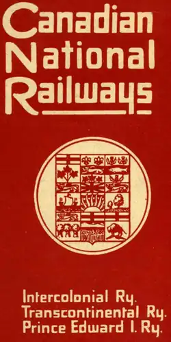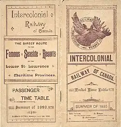 Sur les horaires (Time Table) de 1885 et 1890, lINTERCOLONIAL apparaît en gros caractères avec en dessous, « railway of Canada » (sur celui de 1885, il n'y a pas encore la tête d'orignal). « ICR » a été le sigle du chemin de fer Intercolonial pendant la majeure partie de son histoire ; mais lors de la Première Guerre mondiale, il a été changé pour IRC, Intercolonial Railway of Canada[13]. Les publications de l'Intercolonial, les articles de journaux et l'usage populaire ont continué d'utiliser ICR. Le logo du chemin de fer était une tête d'orignal mâle qui faisait partie d'une campagne de promotion touristique pour les amateurs de chasse et de pêche ; le logo est rarement apparu sur le matériel roulant. Une série d'écussons des 7 provinces canadiennes de l'époque apparaît à l'endos de l'horaire : Ontario, Québec, Nouveau-Brunswick, Nouvelle-Écosse (avant 1929), Manitoba, Colombie- Britannique (avant 1905) et Îles-du-Prince-Édouard ; une série plus complète se retrouvera sur les horaires du Canadian Government Raylways et du Canadian National Raylways : Ontario, Québec, Nouvelle-Écosse, Nouveau-Brunswick, Colombie-Britannique, Île-du-Prince-Édouard, Saskatchewan, Alberta et Manitoba.