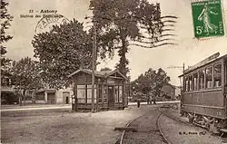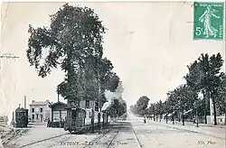 L'Arpajonnais à Antony, au tout début du XXe siècle. La ligne aérienne pour la traction électrique est déjà installée, mais le train est tracté par une locomotive à vapeur.