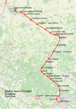 - ↑ « Horaires 1943 Ligne Cognac-Saint-Jean-d'Angély ».