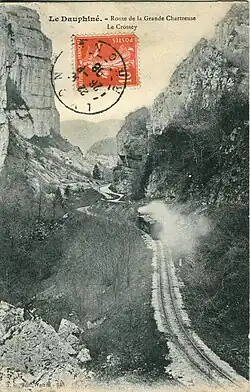Le tramway du VSB sur la route surplombant les gorges de Chailles, au tout début du XXe siècle | ||||||||||||||||||||||||||||||||||||||||||||||||||||||||||||||||||||||||||||||||||||||||||||||||||||||||||||||||||||||