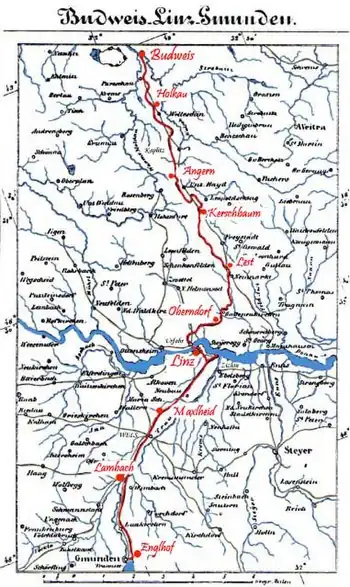 La ligne à voie unique avec de nombreux évitements reliait Budweis à la maison principale de péage à Linz sur une longueur de 128,8 km (17 ½ lieues autrichiennes). De la maison principale de péage jusqu'à la place principale de Gmunden, c'étaient 67,9 km supplémentaires. La ligne vers Budweis avait un caractère montagneux. De Linz (254 m d’altitude), la voie devait s'élever non loin du sommet de Kerschbaumer (714 m d’altitude). Jusqu’à Budweis, la ligne avait une pente jusqu’à 385,5 m d’altitude. La déclivité maximale était de 21,8 ‰.