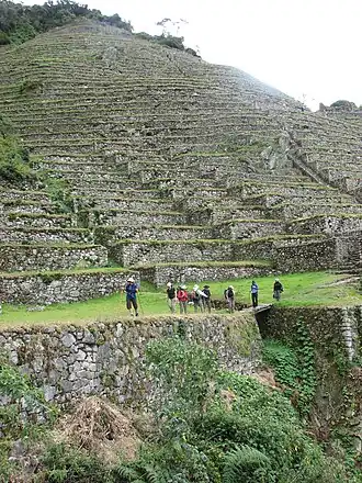 Aux environs des terrasses incas d'Intipata, le parcours classique est rejoint par le parcours "rapide" au niveau d'un camp doublé du refuge Caruso (2 650 m)[7], juste à temps pour accéder au site de Wiñay Wayna. Commence alors l'ascension du mont Machu Picchu, jusqu'à l'abrupt escalier final qui permet d'atteindre à 2 700 m d'altitude Inti Punku (en), la Porte du soleil, incluse dans le site de Machu Picchu mais surplombant les ruines principales de plus de 200 mètres[8].