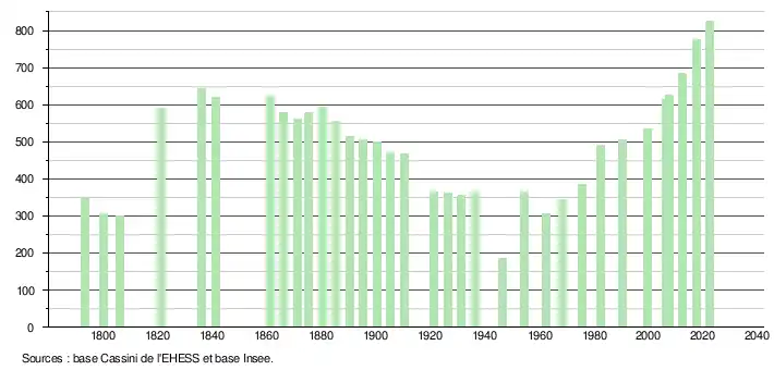 - ↑ Population municipale de référence en vigueur au 1er janvier 2025, millésimée 2022, définie dans les limites territoriales en vigueur au 1er janvier 2024, date de référence statistique : 1er janvier 2022.