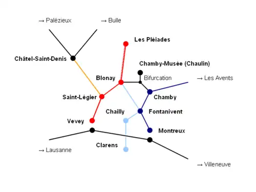 Actuellement, le réseau se limite aux lignes Vevey-Blonay et Blonay-Les Pléiades.