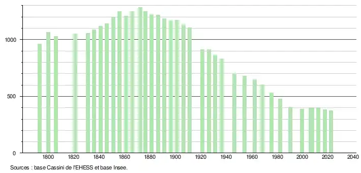 L'évolution du nombre d'habitants est connue à travers les recensements de la population effectués dans la commune depuis 1793. Pour les communes de moins de 10 000 habitants, une enquête de recensement portant sur toute la population est réalisée tous les cinq ans, les populations de référence des années intermédiaires étant quant à elles estimées par interpolation ou extrapolation[24]. Pour la commune, le premier recensement exhaustif entrant dans le cadre du nouveau dispositif a été réalisé en 2007[25].