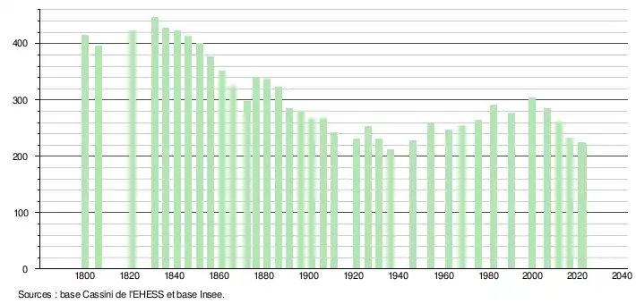 L'évolution du nombre d'habitants est connue à travers les recensements de la population effectués dans la commune depuis 1800. Pour les communes de moins de 10 000 habitants, une enquête de recensement portant sur toute la population est réalisée tous les cinq ans, les populations de référence des années intermédiaires étant quant à elles estimées par interpolation ou extrapolation[46]. Pour la commune, le premier recensement exhaustif entrant dans le cadre du nouveau dispositif a été réalisé en 2006[47].