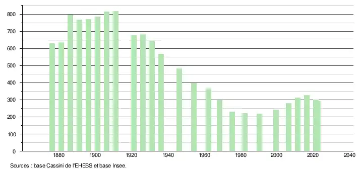 L'évolution du nombre d'habitants est connue à travers les recensements de la population effectués dans la commune depuis 1876. Pour les communes de moins de 10 000 habitants, une enquête de recensement portant sur toute la population est réalisée tous les cinq ans, les populations de référence des années intermédiaires étant quant à elles estimées par interpolation ou extrapolation[23]. Pour la commune, le premier recensement exhaustif entrant dans le cadre du nouveau dispositif a été réalisé en 2006[24].