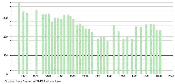 L'évolution du nombre d'habitants est connue à travers les recensements de la population effectués dans la commune depuis 1793. Pour les communes de moins de 10 000 habitants, une enquête de recensement portant sur toute la population est réalisée tous les cinq ans, les populations de référence des années intermédiaires étant quant à elles estimées par interpolation ou extrapolation[15]. Pour la commune, le premier recensement exhaustif entrant dans le cadre du nouveau dispositif a été réalisé en 2006[16].