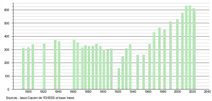 L'évolution du nombre d'habitants est connue à travers les recensements de la population effectués dans la commune depuis 1793. Pour les communes de moins de 10 000 habitants, une enquête de recensement portant sur toute la population est réalisée tous les cinq ans, les populations de référence des années intermédiaires étant quant à elles estimées par interpolation ou extrapolation[22]. Pour la commune, le premier recensement exhaustif entrant dans le cadre du nouveau dispositif a été réalisé en 2006[23].