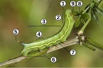 Les trois segments thoraciques portent chacun une paire de vraies pattes tandis que certains segments abdominaux présentent des fausses pattes munies de crochets, ou de ventouses.